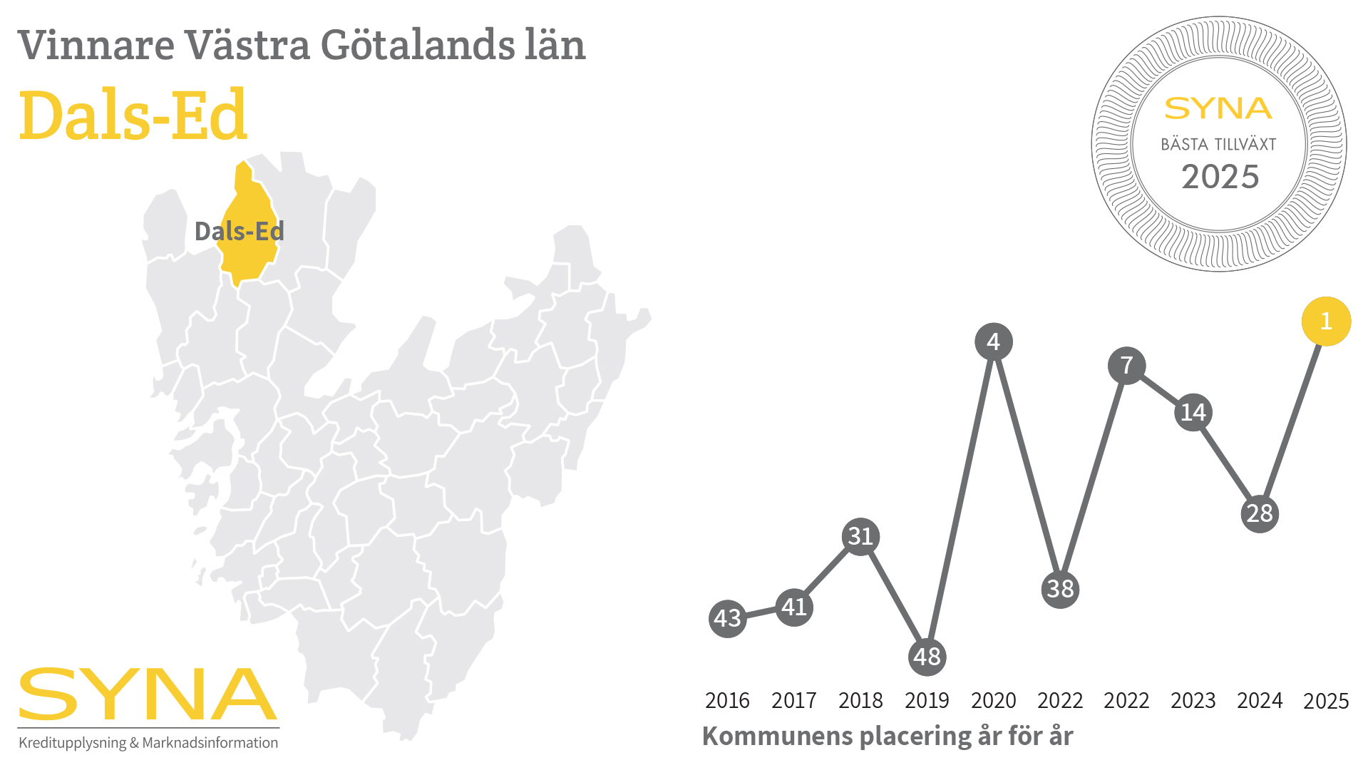 Dals-Ed tar hem utmärkelsen Bästa Tillväxt i Västra Götalands län 2025. På andra och tredje plats kommer Svenljunga respektive Gullspångs kommuner.