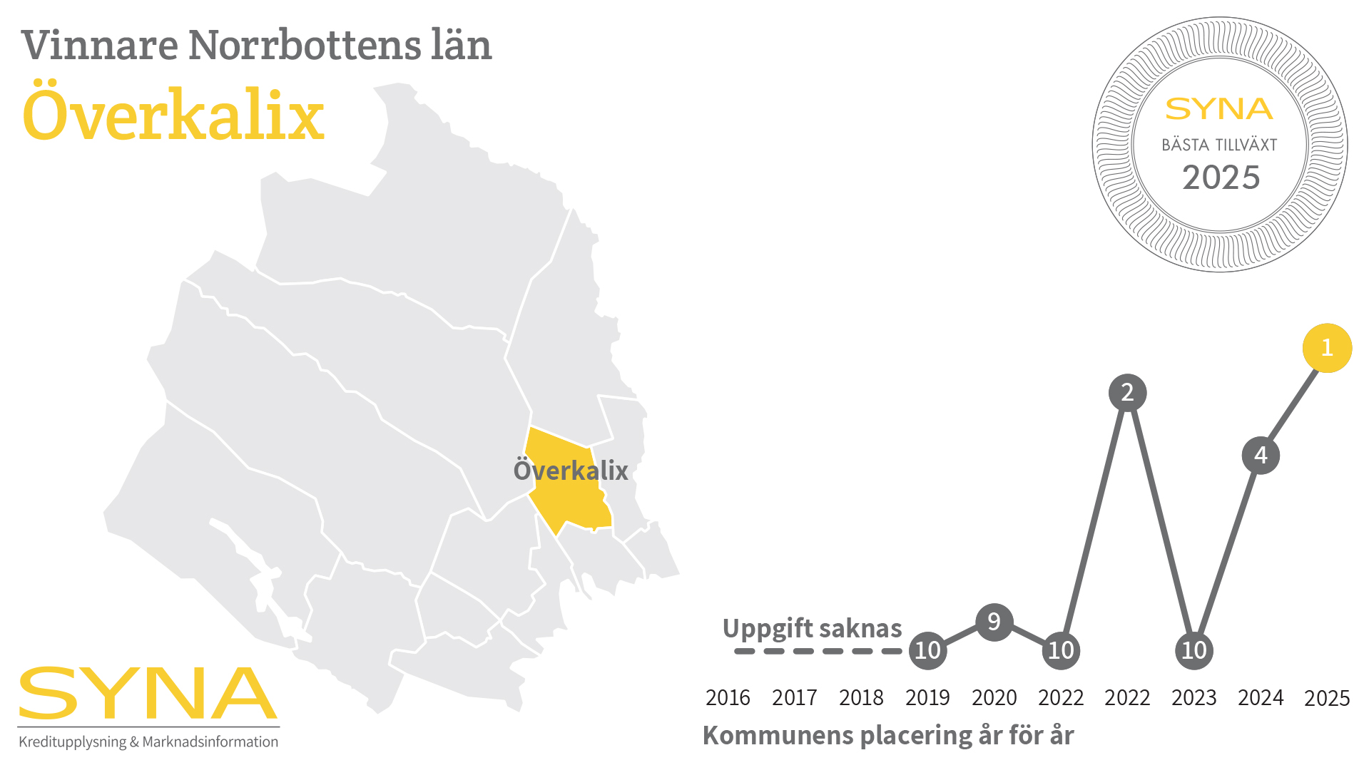 Överkalix tar hem utmärkelsen Bästa Tillväxt i Norrbottens län 2025. På andra och tredje plats kommer Gällivare respektive Bodens kommuner.
