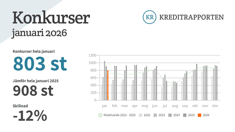 Antalet konkurser minskade kraftigt i januari. Sammantaget gick 803 aktiebolag i konkurs. En minskning med 12 procent. Förra året var ett dystert år sett i ett konkursperspektiv. Under 2025 gick hela 10 095 aktiebolag i konkurs, ungefär lika många som under 2024, som också var ett år med högt konkurstryck. – För januari månad ser dock utvecklingen ut att ha vänt. Konkurserna minskade med 12 procent och är de lägsta för januari månad under de tre senaste åren, säger...